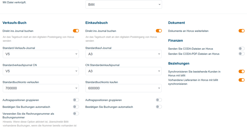 Mithilfe dieser Verknüpfung können Sie noch nicht verarbeitete UBL-Rechnungen ganz einfach direkt und automatisch aus Billit in Horus importieren. Akten erstellen Sie in Billit mit wenigen Mausklicks aufgrund von historischen Daten in Horus. Dadurch importieren Sie nicht nur die Aktendaten selbst, sondern auch alle Kunden- und Lieferantendaten einschließlich Sachkonten aus der Horus-Akte in Billit.