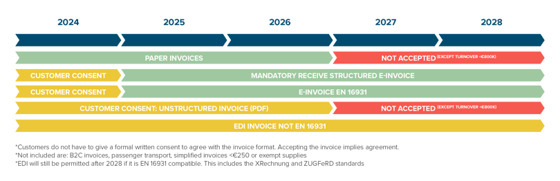 On 22 March, the German Bundesrat voted in favour of a compromise version of the ‘Wachstumschancengesetz’, or Growth Opportunities Act. That has cleared the way for the gradual introduction of mandatory structured electronic invoicing (e-invoicing) in Germany. From January 2025 onwards, German companies will be required to accept e-invoices for B2B transactions.