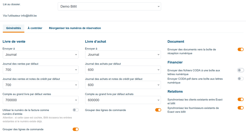 Sur cet écran, vous pouvez spécifier l’endroit où les factures d’achat et de vente peuvent être envoyées dans Exact et le compte par défaut qui doit être inclus (au cas où aucun autre compte au grand livre ne serait défini à un autre niveau). Si vous choisissez d’enregistrer dans le journal, Billit n’enverra plus de factures UBL à traiter, mais créera automatiquement des écritures dans Exact sur la base des comptes au grand livre prédéfinis. Dans cet écran, vous pouvez également cocher si les fichiers CODA peuvent aussi être envoyés à la boîte aux lettres numérique d’Exact Online (uniquement quand l’entrepreneur est lié à la banque via Billbank ou CBC).