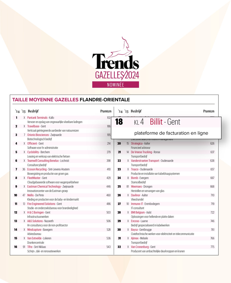 Et nous n’en sommes pas peu fiers ! Hier, Billit s’est vu décerner le titre de Trends Gazelle 2024. Nous avons décroché une belle 18e place au classement des moyennes entreprises de Flandre-Orientale. C'est beau de voir que nous avons pu progresser en un an de la catégorie des petites entreprises à celle des entreprises de taille moyenne.
