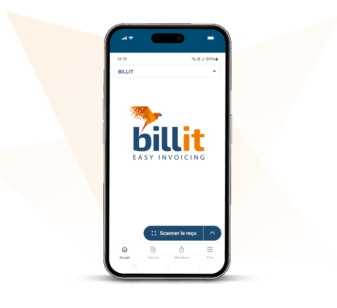 L’appli Billit est la petite sœur mobile de la plateforme Billit. Vous pouvez l’utiliser pour établir et envoyer des factures où que vous soyez, mais aussi pour scanner des reçus et enregistrer votre temps de travail en un clin d’œil.
