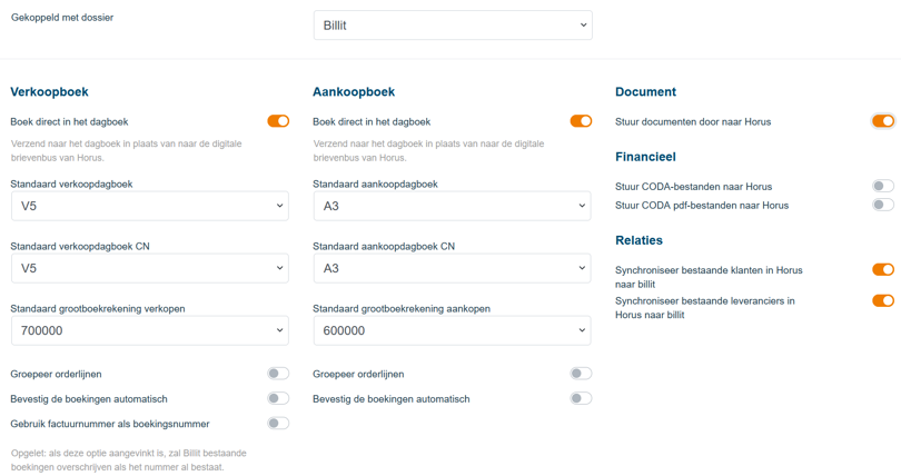 Dankzij deze koppeling kun je te verwerken UBL-facturen makkelijk vanuit Billit rechtstreeks en automatisch in Horus importeren. Je dossiers aanmaken in Billit doe je in enkele muisklikken op basis van historische data in Horus. Hierdoor importeer je niet alleen de dossiergegevens zelf, maar ook alle klanten- en leveranciersgegevens, inclusief grootboekrekeningen, uit het Horus-dossier in Billit.