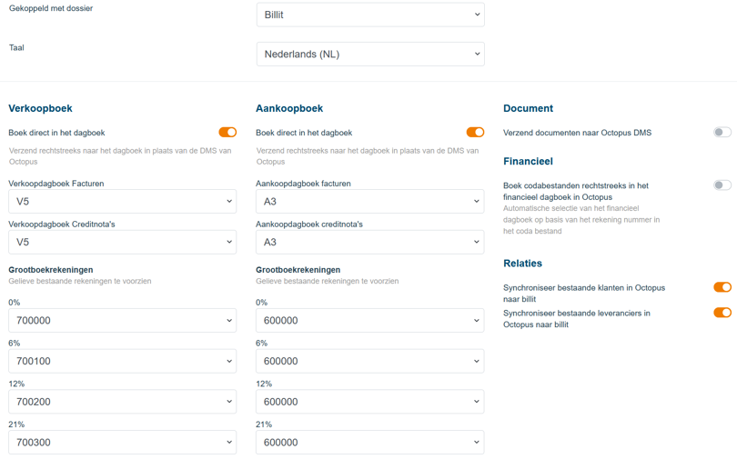 Wanneer je kiest voor inboeken in het dagboek verstuurt Billit geen te verwerken UBL-facturen meer door, maar worden automatisch boekingen aangemaakt in Octopus.