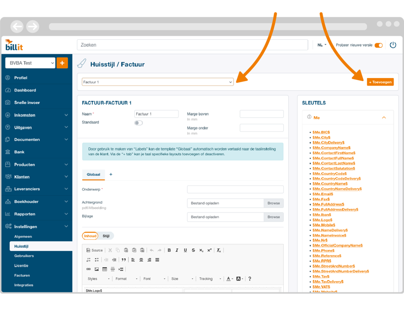 Om een factuurlay-out in te stellen/aan te passen, klik je op het submenu ‘Huisstijl’ onder het menu ‘Instellingen’. Daarna selecteer je het document waarvoor je de lay-out wil aanpassen of een template wil toevoegen.
