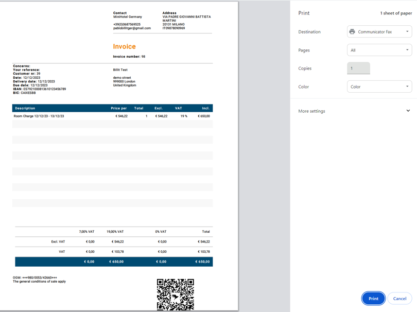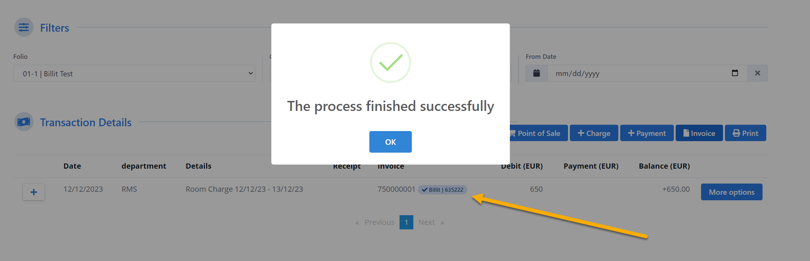 Stap 3: Je krijgt nu een melding dat je digitale factuur succesvol werd aangemaakt. Naast het factuurnummer van Mini Hotel zie je het factuurnummer van Billit. Een groen vinkje geeft aan dat de factuur correct werd doorgestuurd naar Billit. Is dat niet zo, dan krijg je een foutmelding.