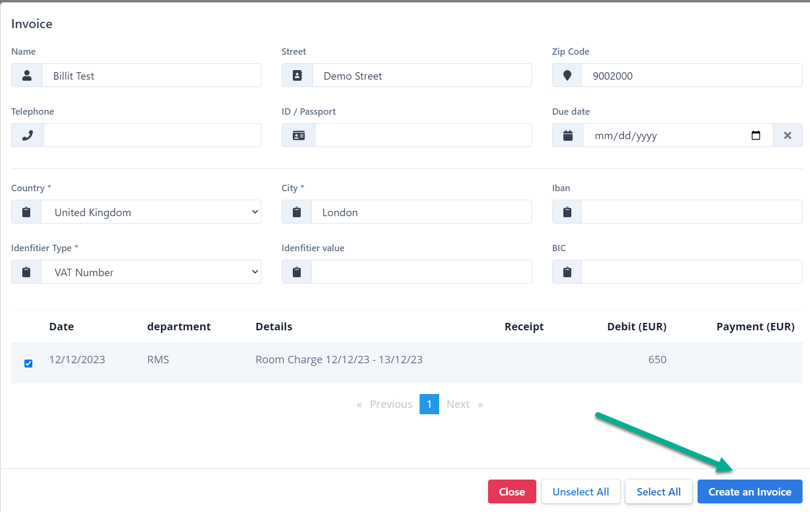 Stap 2: Vervolgens opent er een venster waarin je alle facturatiegegevens kan invullen. Klik als je daarmee klaar bent op ‘Create an Invoice’.