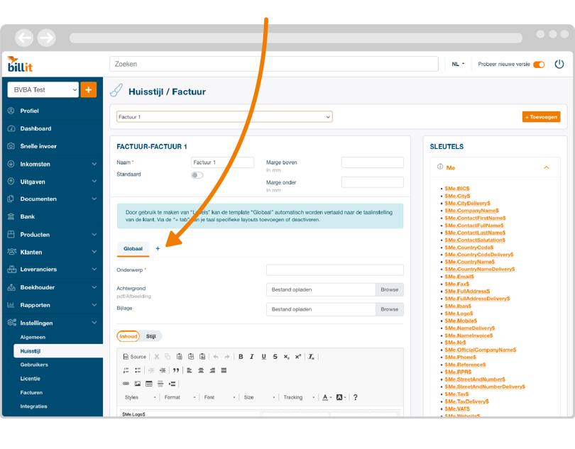 Omdat Billit gebruikmaakt van labelsleutels en inhoudelijke sleutels, wordt een factuur altijd automatisch verstuurd in de taal van je klant (dit is de taal die je aan die klant toewijst in de klantenfiche).